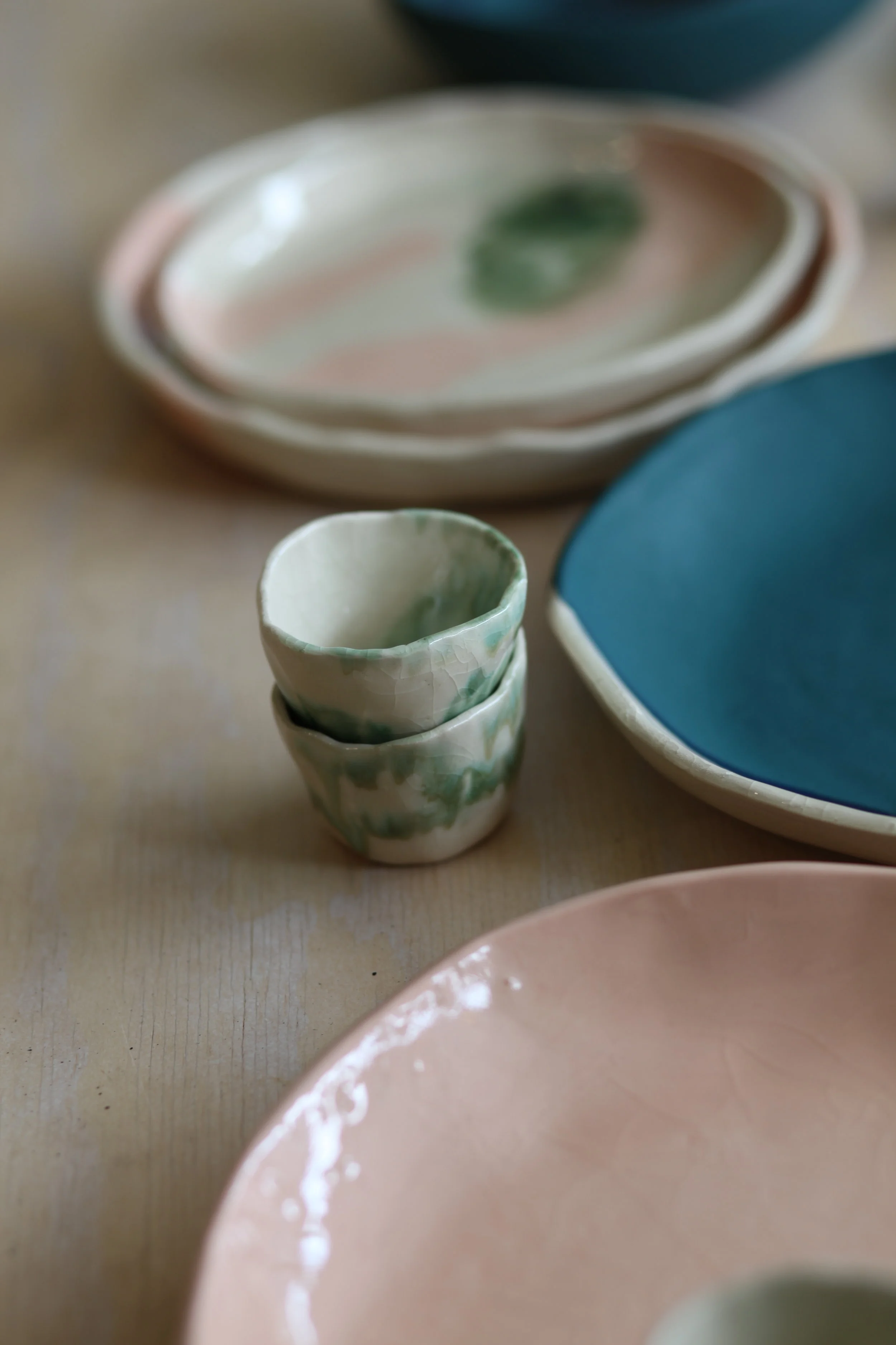 ¡En este proyecto utilice todas las técnicas que se! Todo lo que es melón es cerámica de ese color. Óxidos. Escurridos y manchas para darle profundidad, y algo de espontaneidad a las piezas. Un color azul verdoso profundo que contrasta y a la vez consolida esta colección especial.