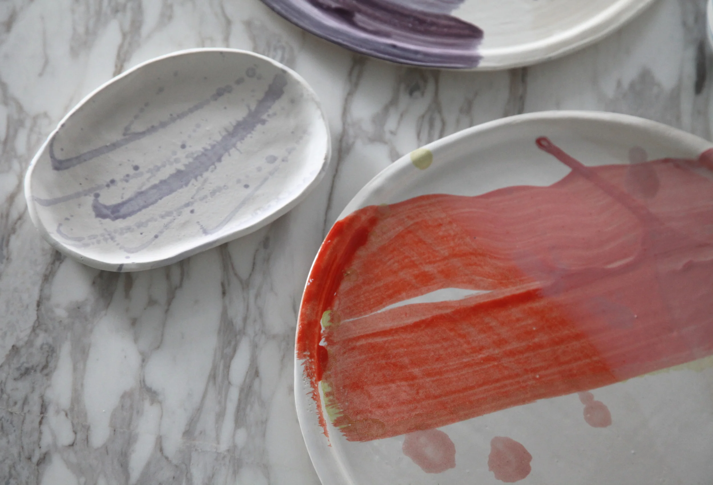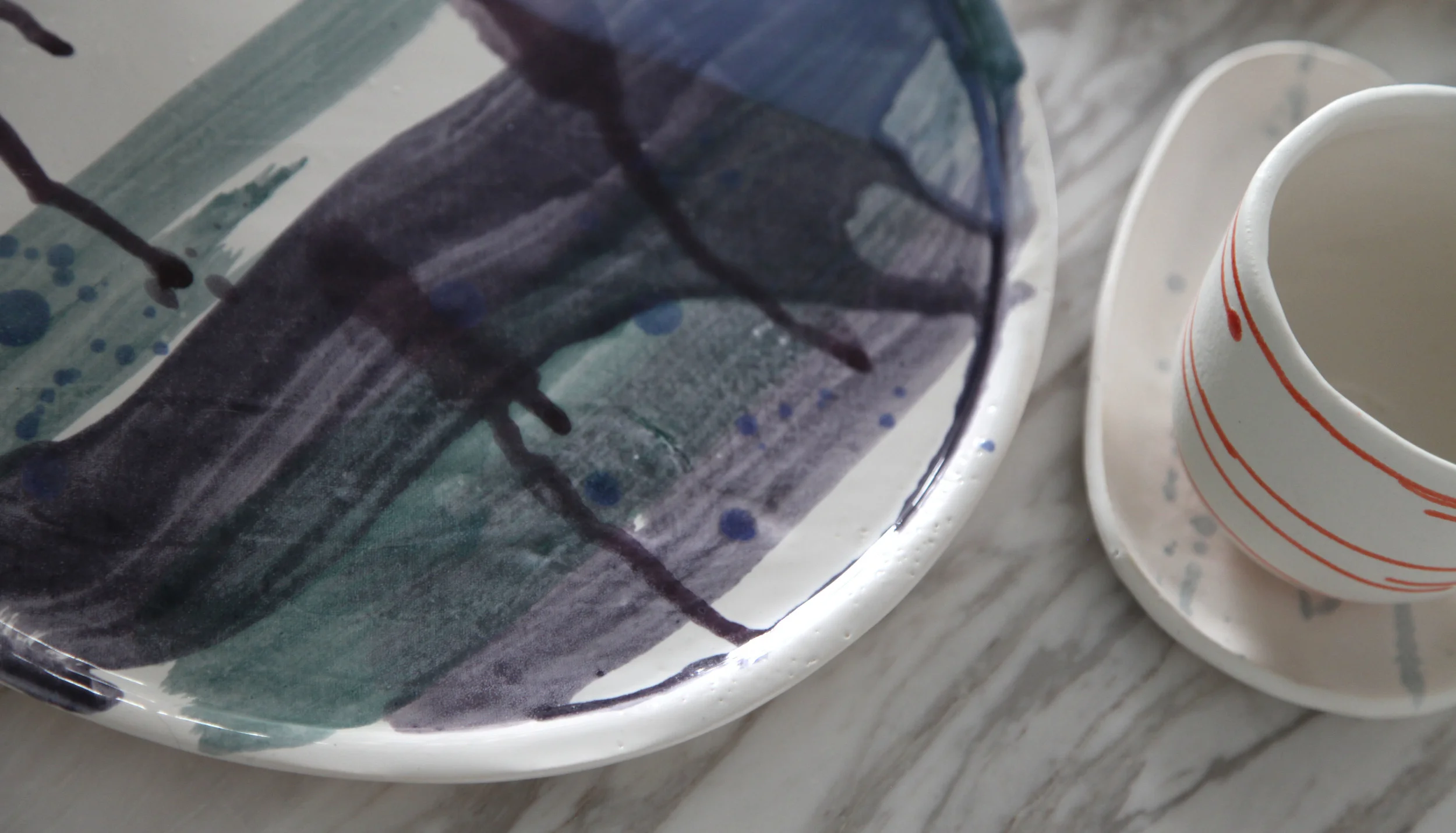 Ocho piezas distintas forman la vajilla para ocho. Después de conocer a los dueños a través de un BRIEF que siempre me ayuda, resultaron tres lineamientos: un diseño de esmaltes abstracto, no negro y la idea de paisajes en cada pieza.